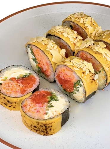 Рис, норі,лосось,огірок,вершковий сир,тостовий сир грильований, заміс краба з соусом,мигдалеві пластівці